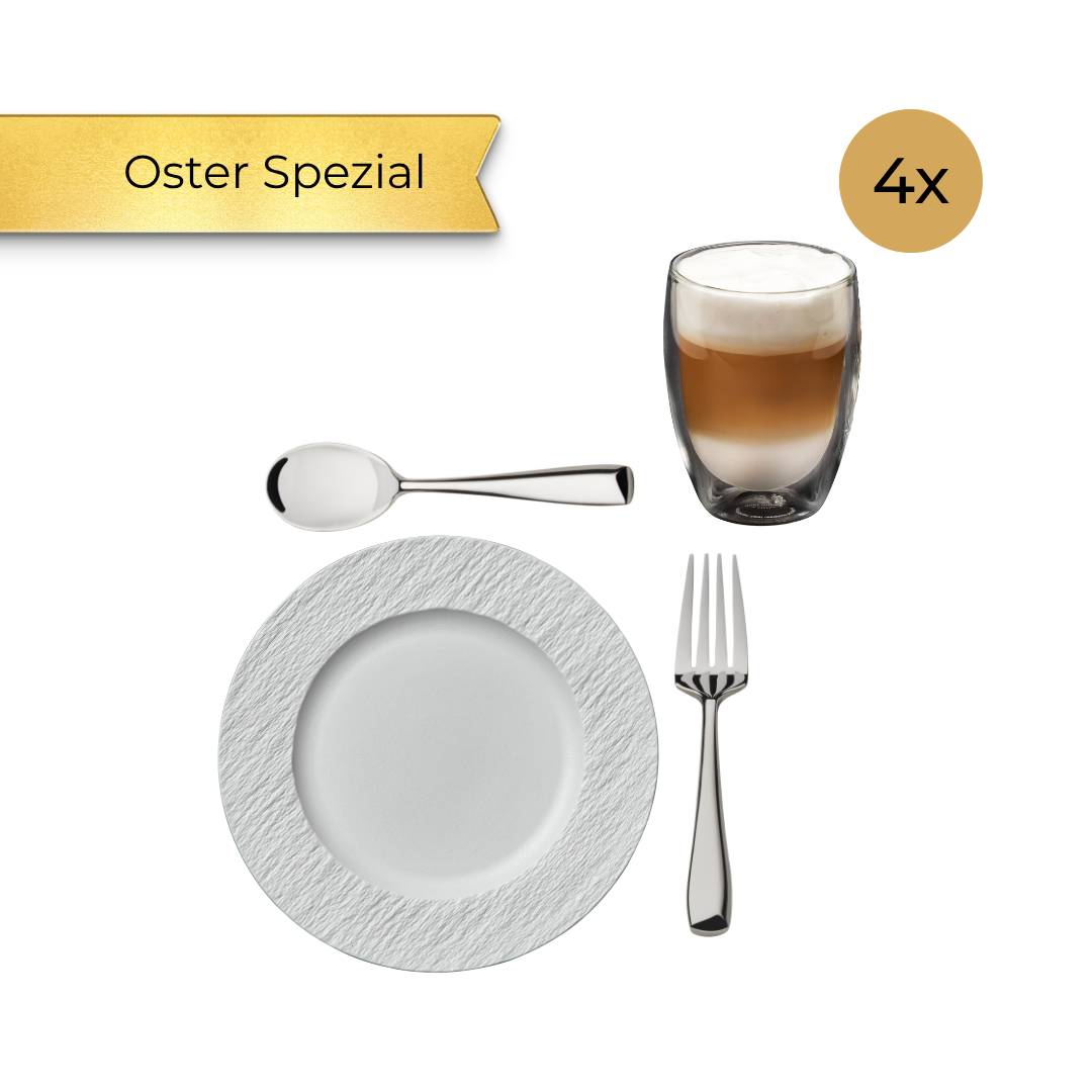 Verwandle die Ostertafel in ein stilvolles Café-Erlebnis: Das Kaffeetafel Set vereint handwerklich gefertigte Porzellan-Dessertteller in edler Schieferoptik, mundgeblasene Latte-Macchiato-Gläser mit Thermo-Isolierung sowie handpolierte Kaffeelöffel und Kuchengabeln aus hochwertigem Edelstahl. Vier Personen genießen gemeinsam in Eleganz, Qualität und Stil. Ein perfektes Geschenk zu Ostern für alle, die den stilvoll gedeckten Tisch lieben.