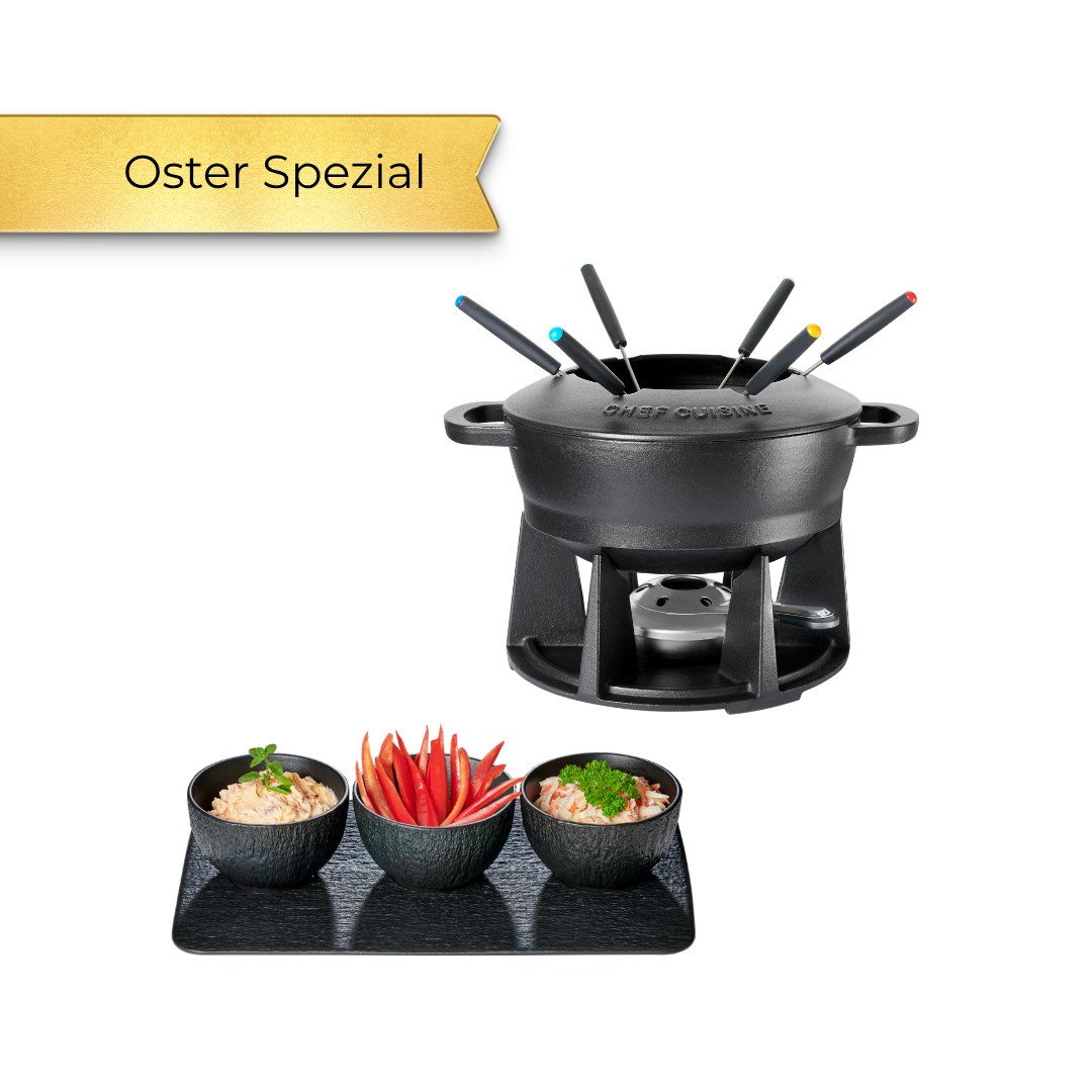 Gesellige Abende voller Genuss: Das Fondue Set vereint einen hochwertigen Gusseisen-Fonduetopf mit elegantem Edelstahl-Rechaud und ein handwerklich gefertigtes Porzellan-Dipschalen Set in edler Schieferoptik. Ob herzhaftes Fleisch, schmelzender Käse oder verführerische Schokolade: Dieses Set macht jeden Tisch zum Schauplatz kulinarischer Abenteuer. Hochwertige Materialien, durchdachtes Design und stilvolle Optik für unvergessliche Fondue-Momente zu Ostern und darüber hinaus.