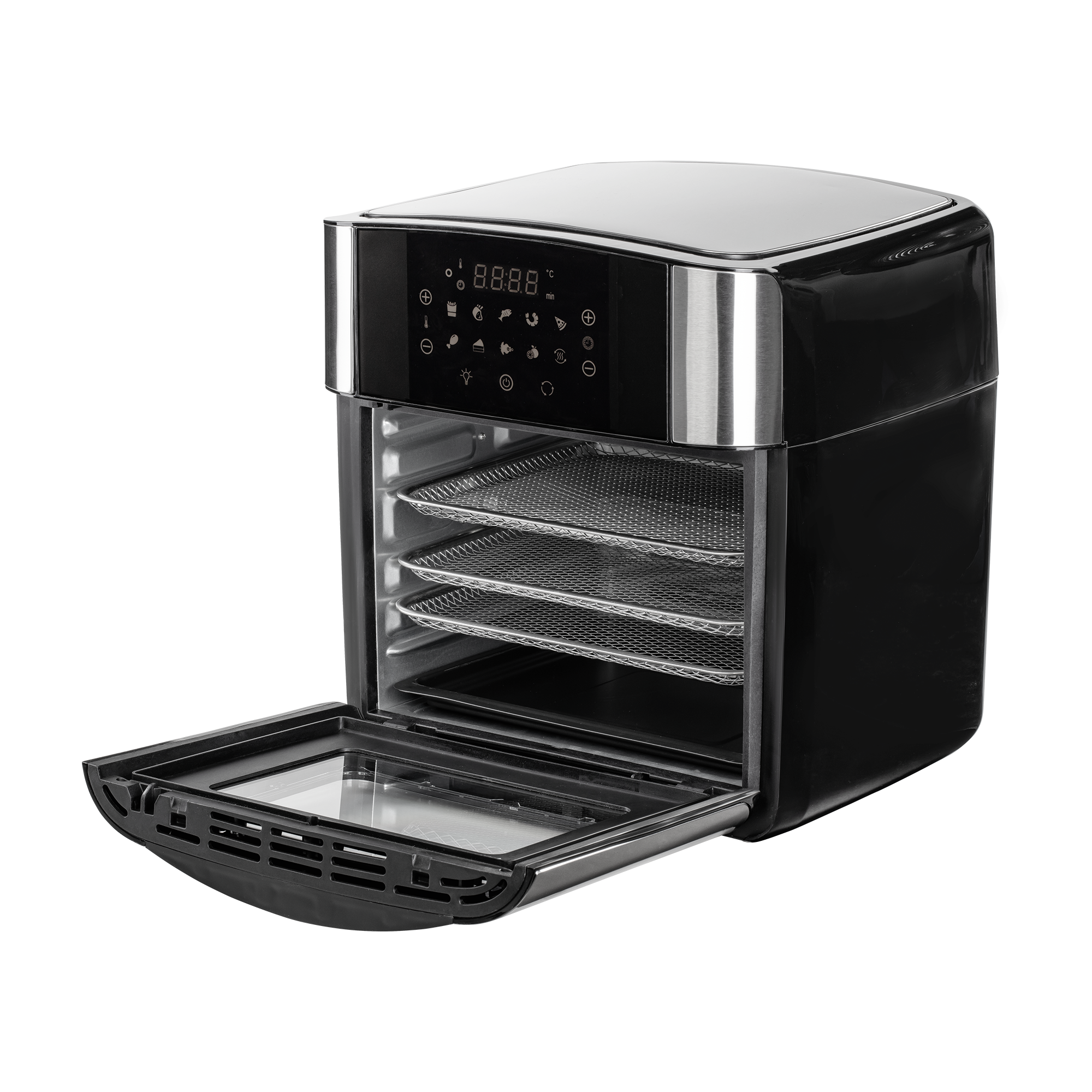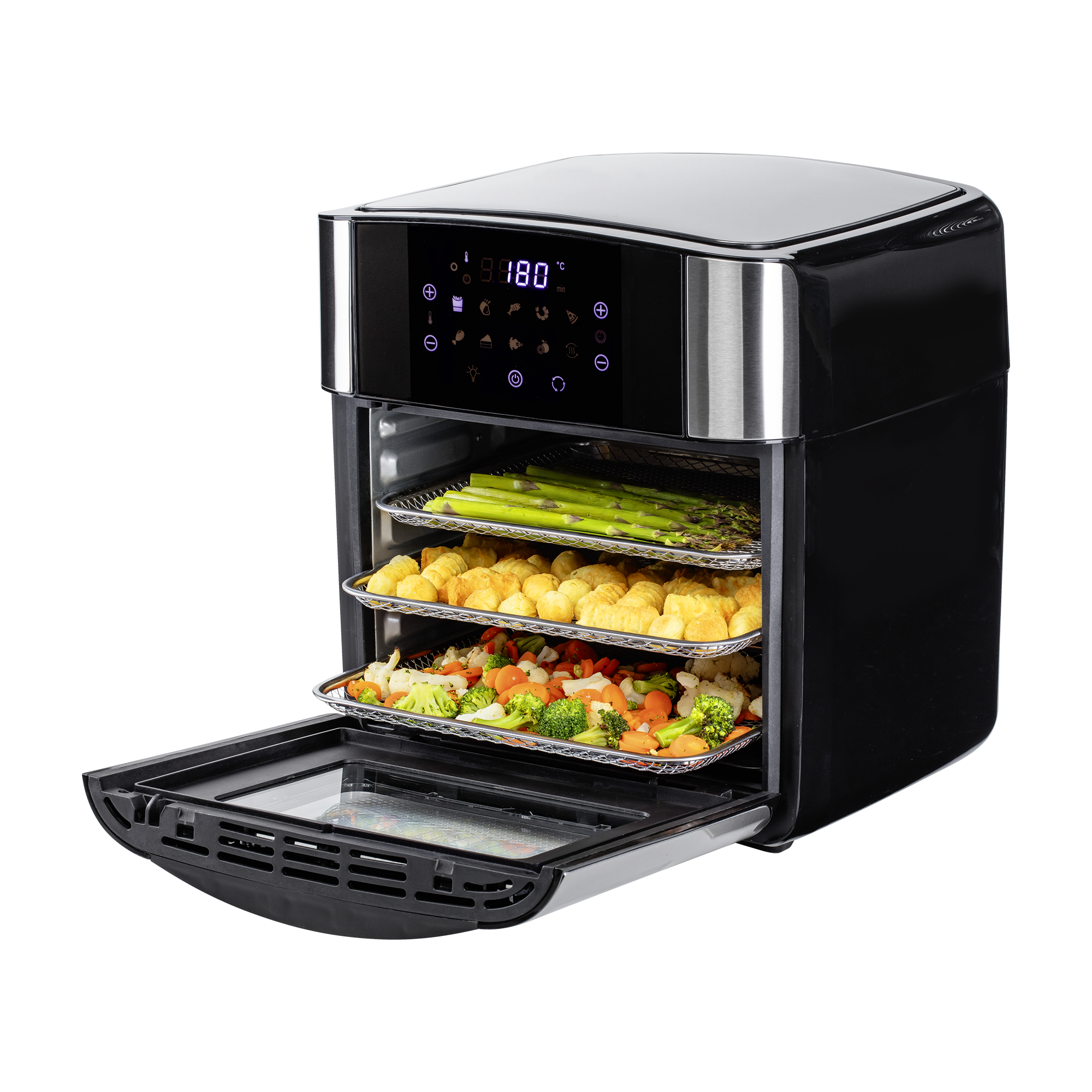- 3-in-1-Funktion: Heißluftfritteuse, Backofen und Dörrgerät mit 15-Liter-Garraum für große Portionen