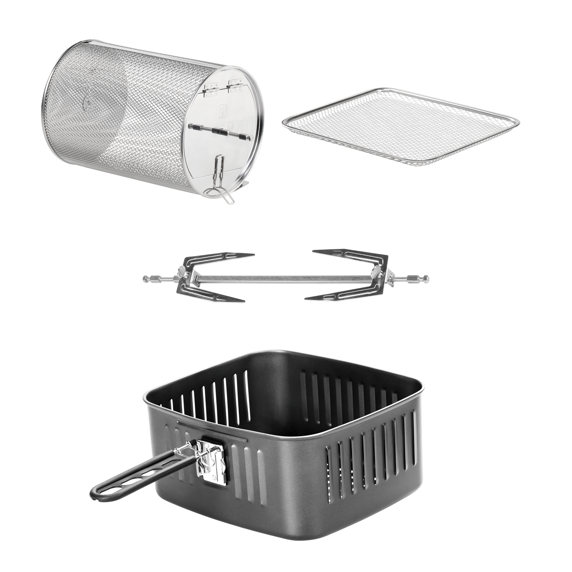 | Lieferumfang | 1 x Air Fryer, 1 x Frittierkorb, 1 x Air-Flow-Gitterrost, 1 x Rotisserie-Korb, 6 x Spieße, 1 x Halterung für Geflügel und Braten, 1 x Fettauffangschale, 1 x Greifarm |