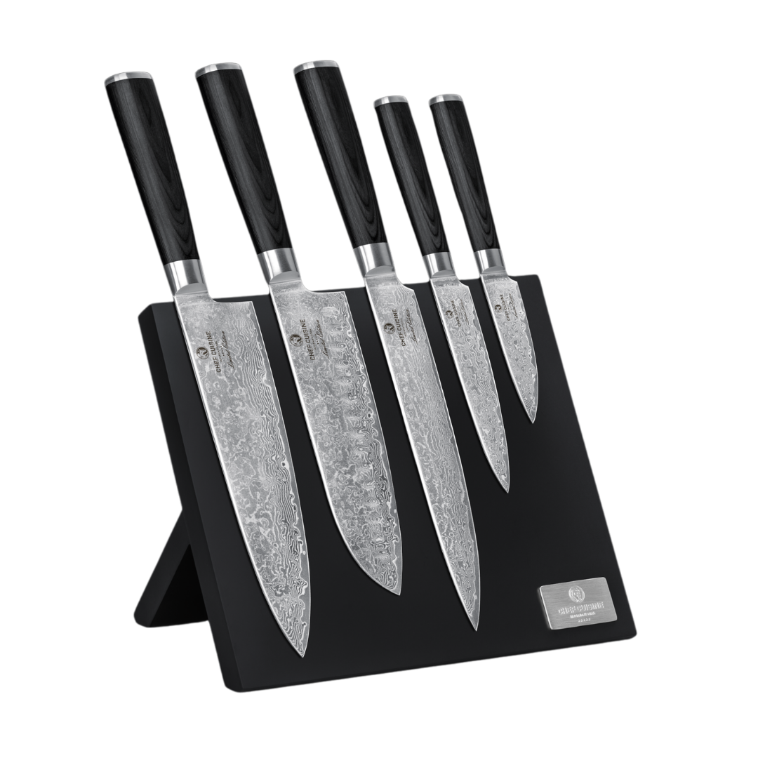 Vielseitig: Das Set umfasst ein Chefmesser, ein Santokumesser, ein Fleischmesser, ein Allzweckmesser sowie ein Schäl- und Garniermesser und deckt damit jede Schneideaufgabe in der Küche ab. Der magnetische Messerblock aus widerstandsfähigem Gummibaumholz bietet Platz für bis zu 6 Messer und hält diese dank integrierter Magnetschiene sicher an ihrem Platz.